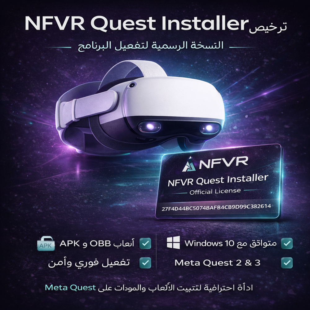 🔑 ترخيص NFVR Quest Installer هو المفتاح الرسمي لتفعيل برنامج NFVR Quest Installer على جهاز الكمبيوتر الخاص بك، ويمنحك تجربة احترافية وسلسة في تثبيت الألعاب والمودات على نظارات Meta Quest.